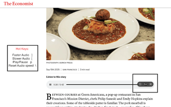 Bu eklenti, Economist.com üzerinde hafif bir şekilde çalışarak kullanıcı deneyimini artırır. Kullanıcılar, ] tuşu ile sesi hızlandırabilir, [ tuşu ile yavaşlatabilir, uşu ile hızı 1.0x değerine sıfırlayabilir ve P tuşu ile çalmayı duraklatabilirler. Ek olarak, bu eklenti veri toplama, izleme veya reklam içermemektedir ve ayarlar her ziyaret arasında hatırlanmaktadır. Ekonomist’in sesli makalelerini daha konforlu bir şekilde dinlemek isteyen okuyucular için idealdir.